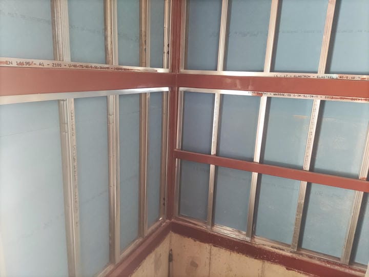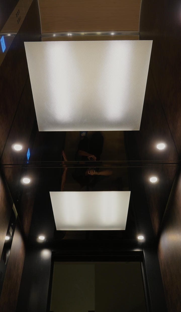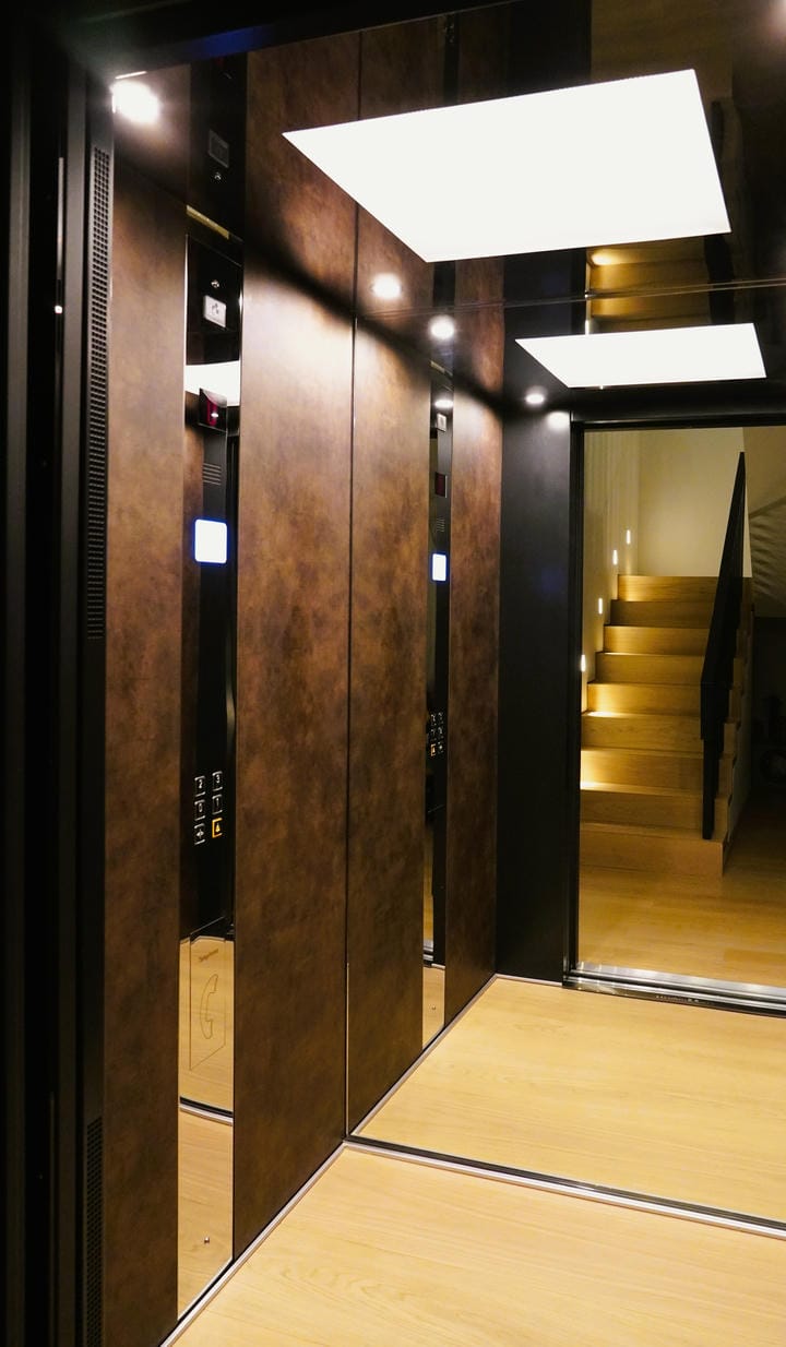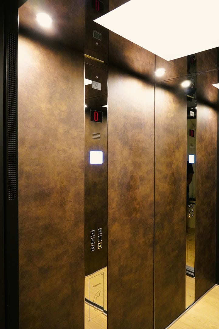 Ο θάλαμος του ανελκυστήρα παραγγέλθηκε από την KLEEMANN χωρίς επένδυση, με πρόβλεψη να τοποθετηθεί στα πλαϊνά μελαμίνη 6 χιλιοστών και ξύλινο δάπεδο. Τα υλικά που τοποθετήθηκαν έφεραν τα απαραίτητα πιστοποιητικά πυραντοχής ώστε να μπορέσει να πιστοποιηθεί ο ανελκυστήρας. Η εργασία τοποθέτησης της μελαμίνης έγινε από ξυλουργό τεχνίτη.