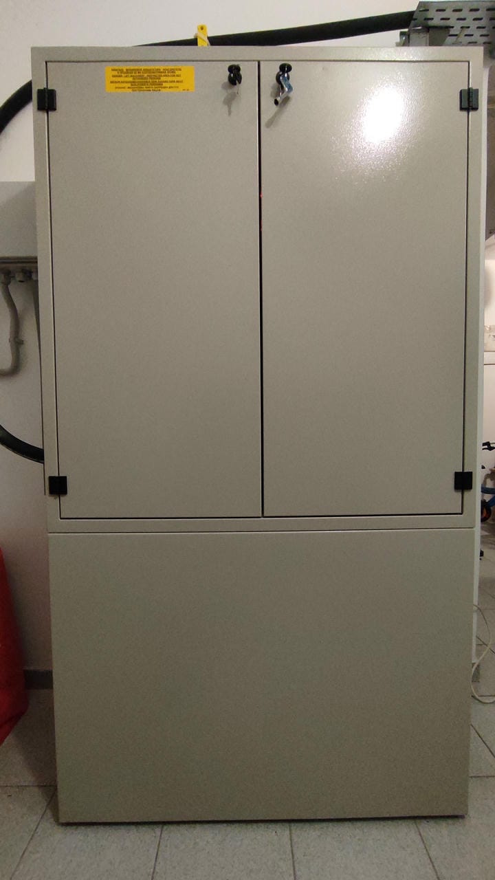 Λόγο της έλλειψης μηχανοστασίου, επιλέχθηκε η λύση του ερμαρίου, το οποίο τοποθετήθηκε σε έναν από τους χώρους του σπιτιού, δίπλα από το φρεάτιο του ασανσέρ.